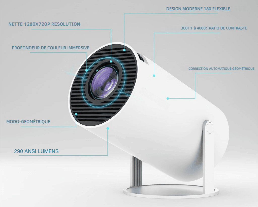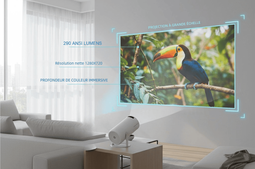 Profitez d'une qualité d'image exceptionnelle grâce à sa résolution 1280x720p HD et ses 290 ANSI lumens. Le contraste 3001:1 à 4000:1 garantit des noirs profonds et des couleurs éclatantes pour une immersion totale. Sa technologie LED et son angle rotatif 180° permettent de projeter sur n’importe quelle surface, même au plafond. L’auto-correction géométrique assure une image parfaitement ajustée sans aucune déformation.