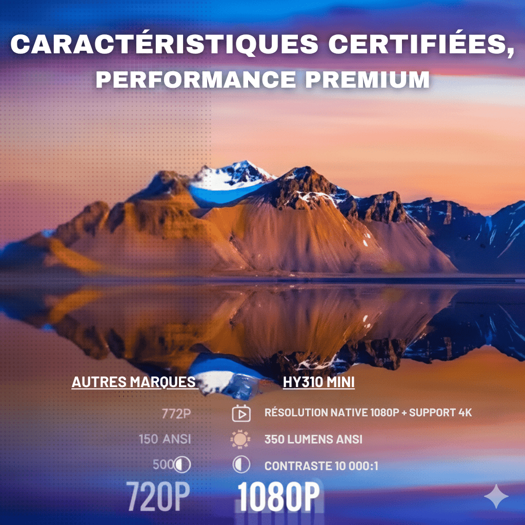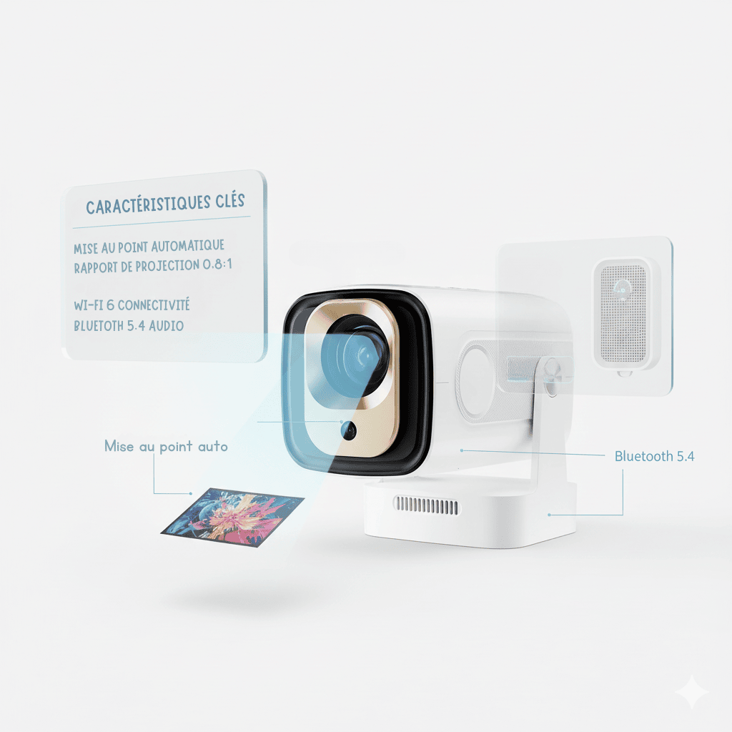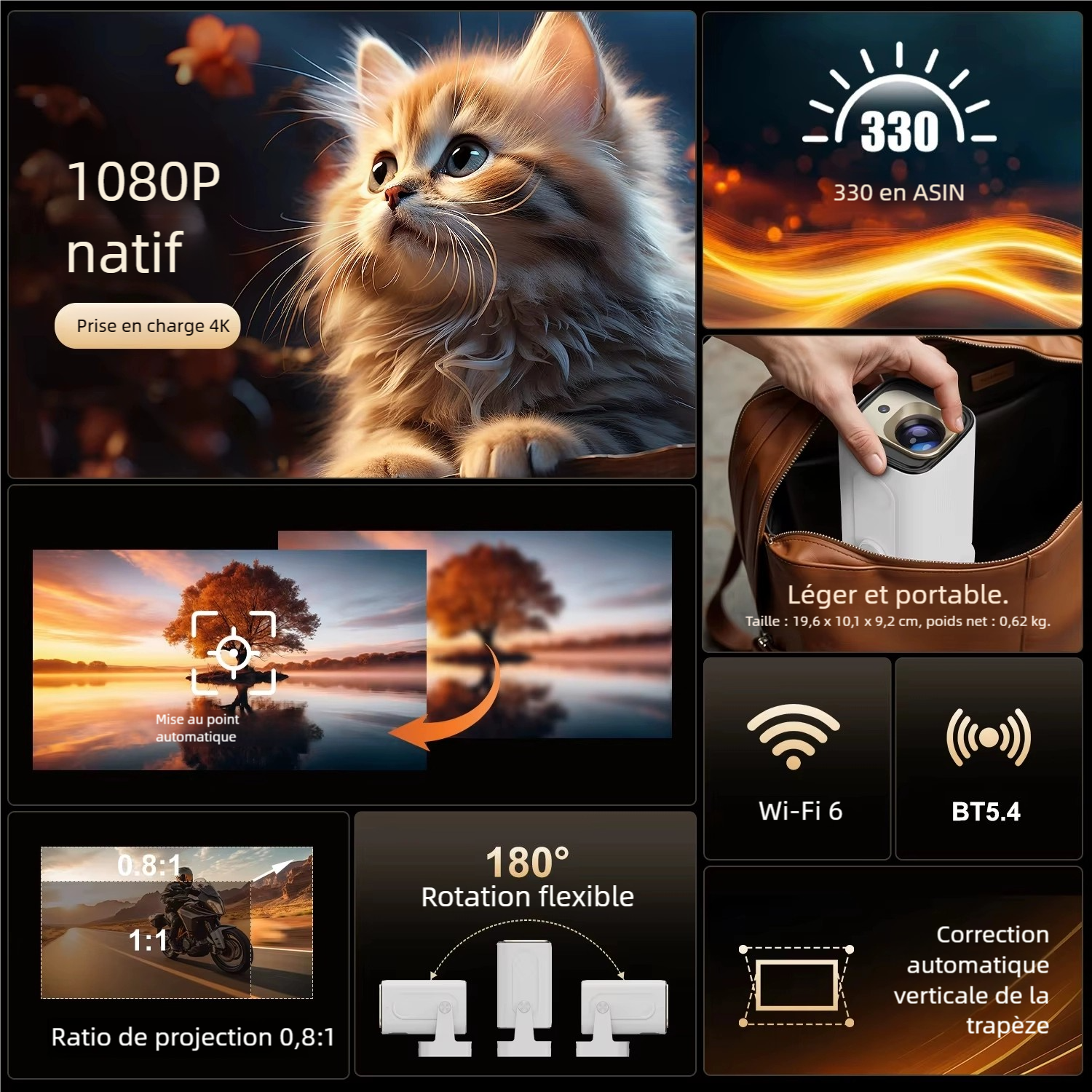 Ce mini vidéoprojecteur offre une résolution native 1080P, compatible 4K, avec 330 ANSI lumens pour des images nettes même en pleine journée. Il intègre une mise au point automatique ainsi que Android 11 avec WiFi 6, vous permettant de streamer Netflix, YouTube et toutes vos applications préférées en un clic. Le Bluetooth 5.4 assure quant à lui un son immersif et performant.