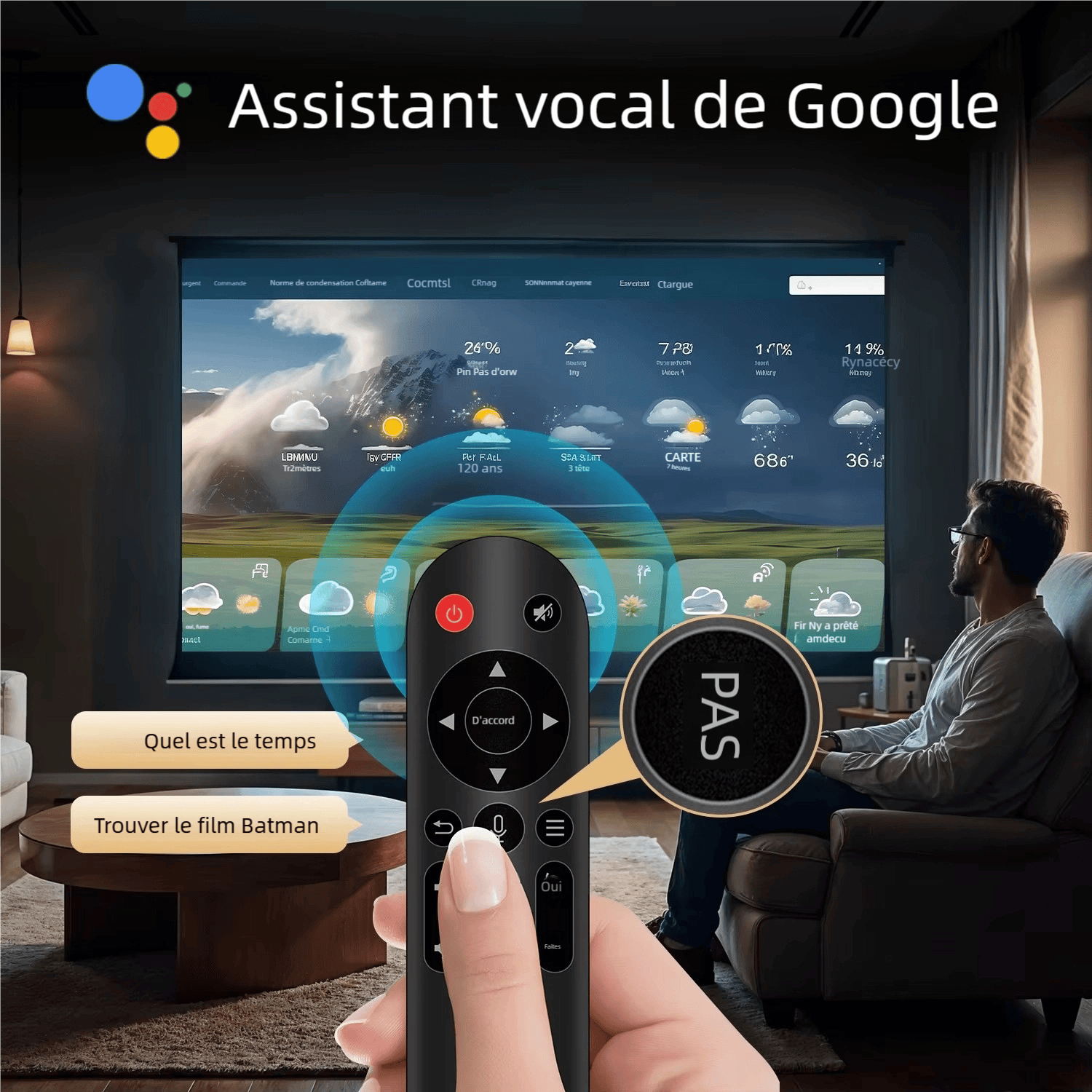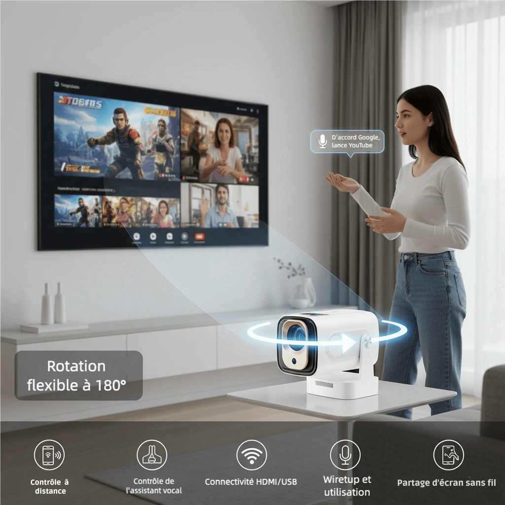 Gaming, films ou présentations professionnelles : ce mini vidéoprojecteur est ultra-polyvalent. Son installation est simple et rapide grâce à sa rotation flexible à 180°, permettant d’ajuster l’image sans aucune contrainte. Profitez de l’assistant vocal Google pour un contrôle instantané et connectez vos appareils facilement via HDMI, USB ou en sans-fil.