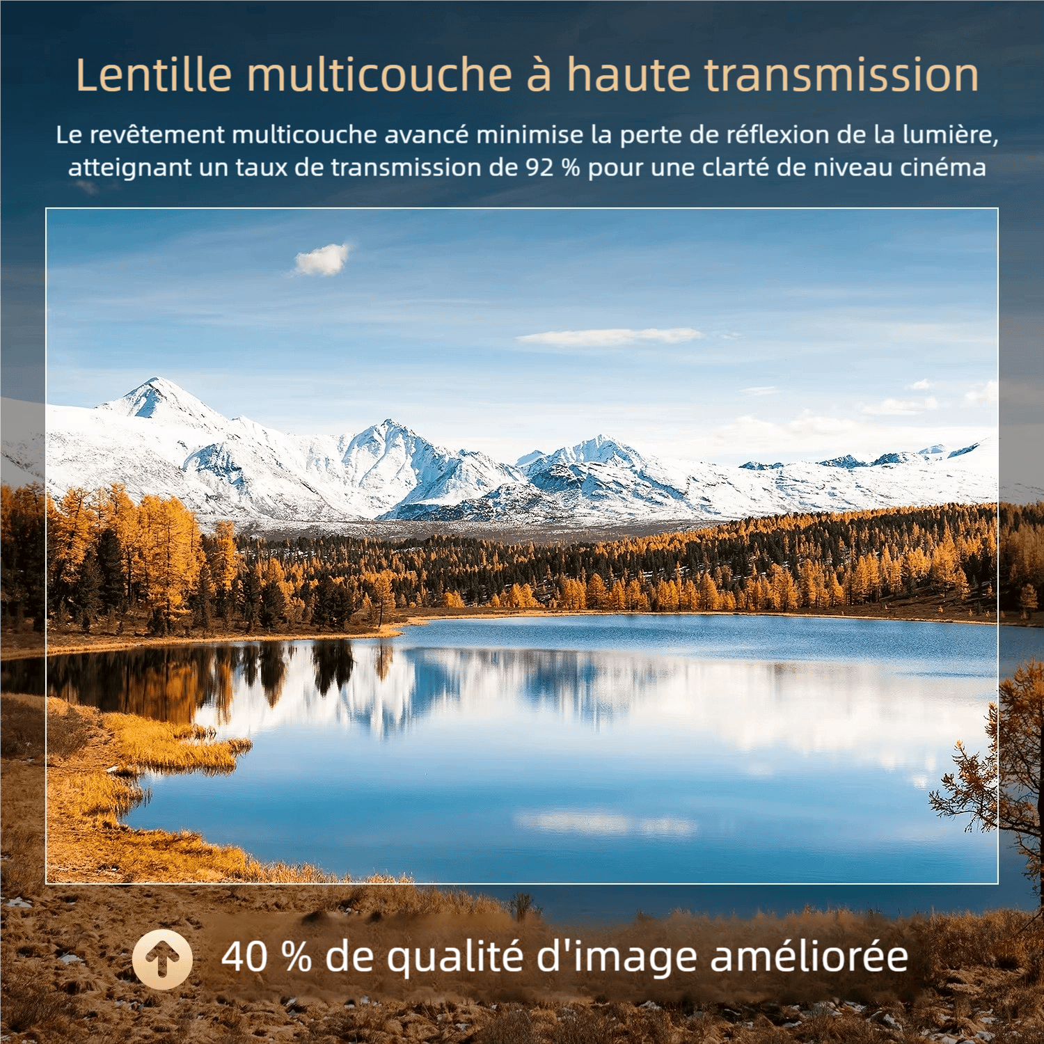 Avec une lentille haute transmission à 92%, ce projecteur offre une clarté +220% supérieure aux modèles standards. Son système de refroidissement avancé réduit la chaleur de 50% et le bruit de 60%, garantissant un visionnage silencieux et confortable. Sa durée de vie de 30 000 heures (environ 10 ans d'utilisation) assure un investissement durable, tandis que le filtre anti-poussière capturant 95% des particules réduit l'entretien de moitié. Placez-le à seulement 1,1 m du mur pour projeter une image de 75 pouces grâce à son rapport de projection 0,8:1.