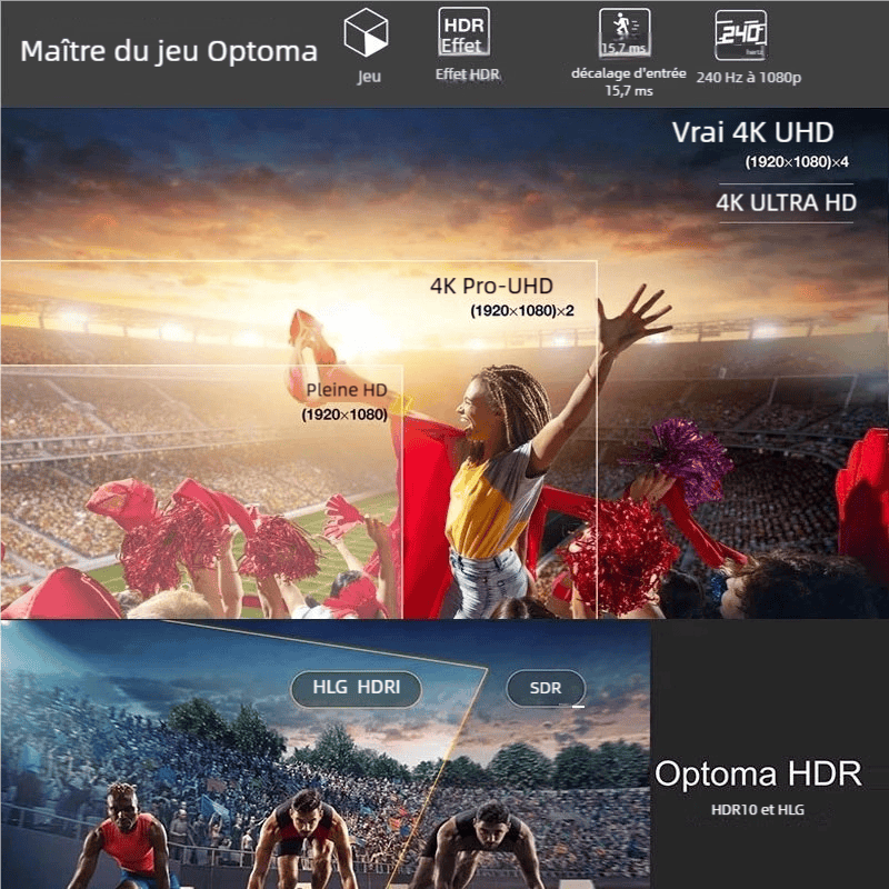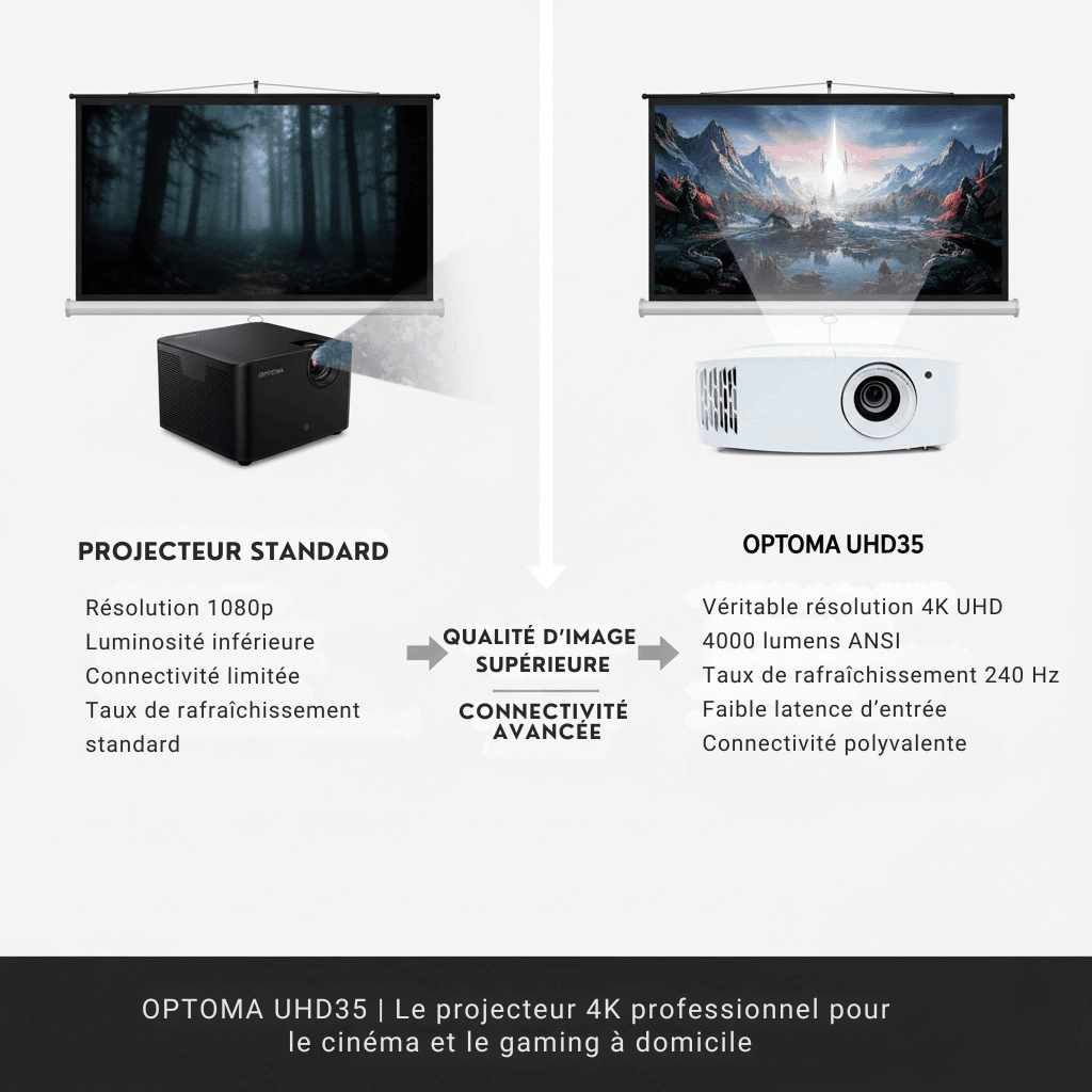 Le OPTOMA UHD35 se démarque clairement de la concurrence grâce à sa technologie DLP et sa véritable résolution 4K UHD, offrant une précision et une netteté incomparables.